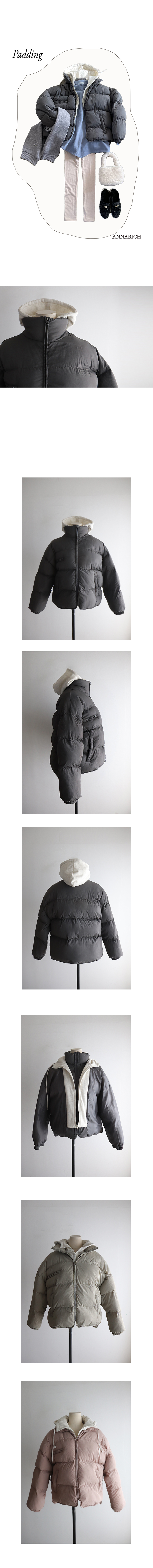 넓은 가로절개로 가장 베이직한 패딩디자인이 구상되어
