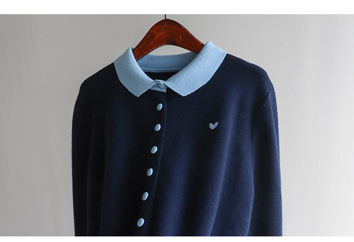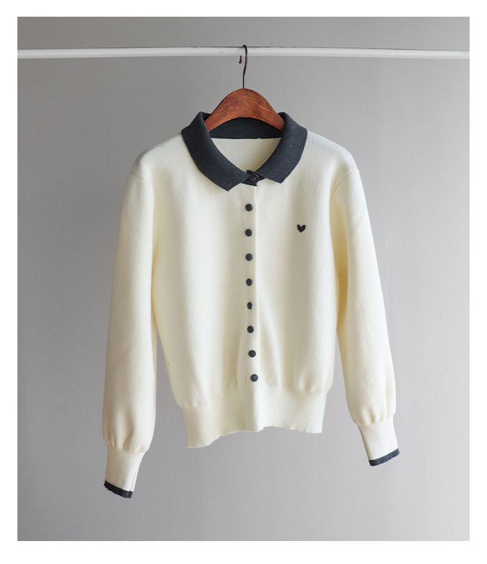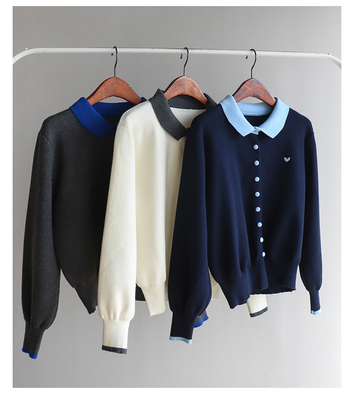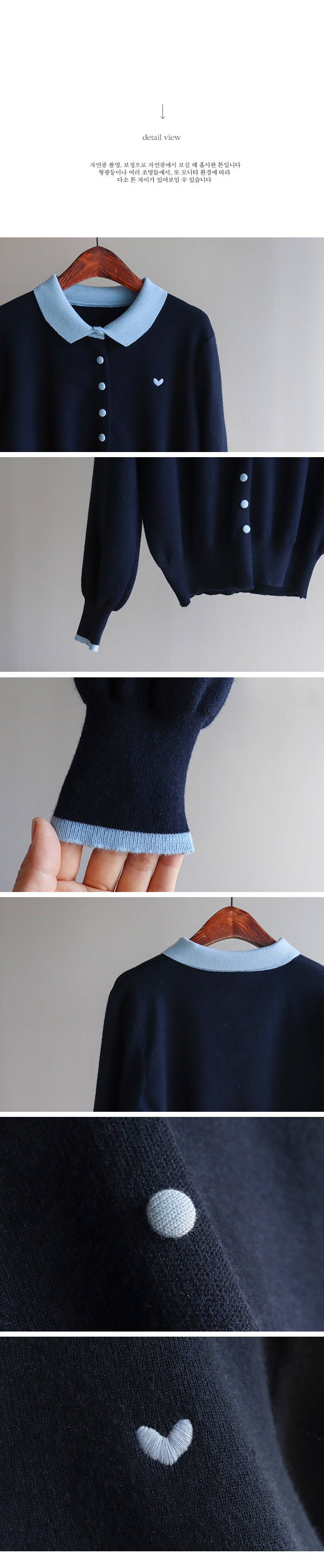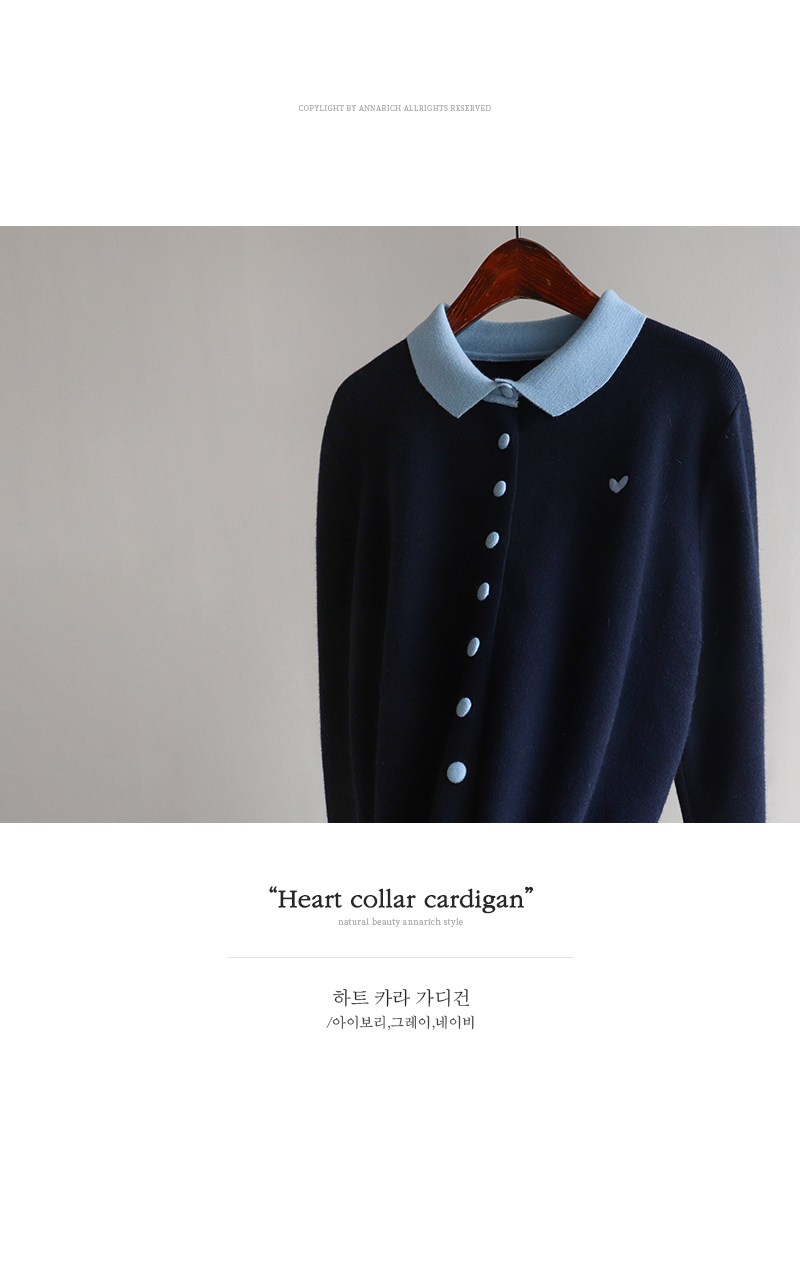 [러블리하고 단정한 무드의 하트 카라 가디건♥] [쫀득~하고 부드러운 촉감으로 편안하게] [배색 컬러의 카라와 싸개 콩단추 포인트] [소매 배색 라인으로 디테일을 높혔어요: )]